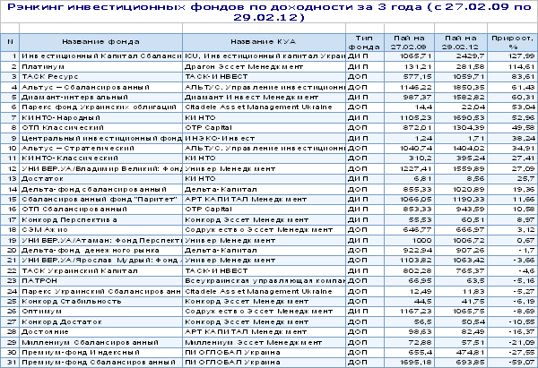результатам деятельности за 3 года , лучшие 3 фонда "Инвестиционный Капитал Сбалансированный" (+127%), "Платинум" (+114%), "ТАСК Ресурс" (+83,61%). Ни один фонд не показал доходности рынка (